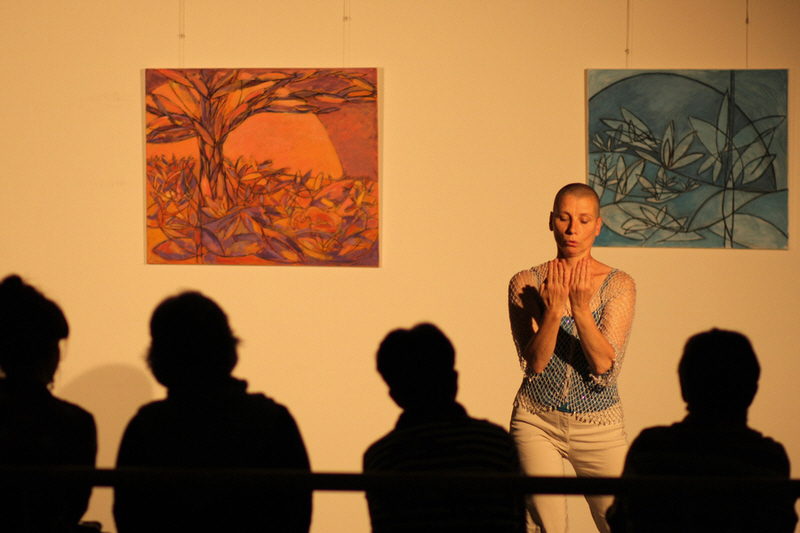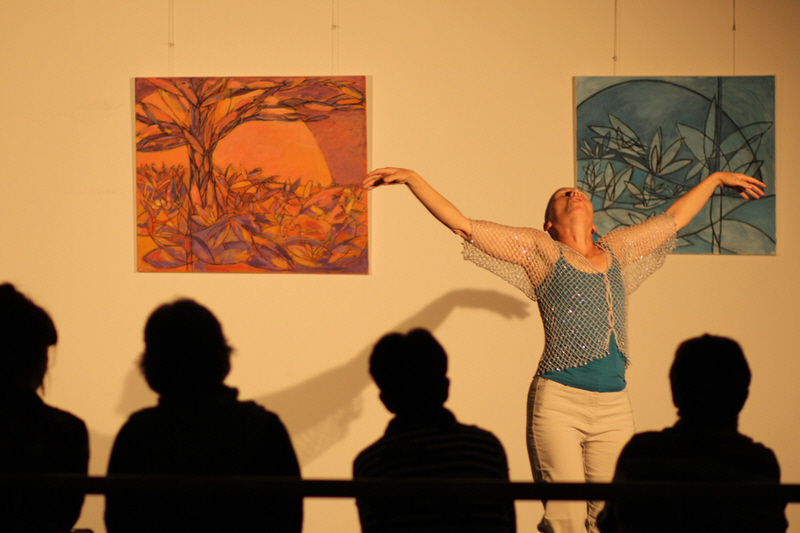 Zur Ausstellungseröffnung am 01. September ging ein heimlicher Wunsch in Erfüllung. In den Bildern von Rosario zu tanzen. Die Schwingungen und Farben ihrer Arbeiten in den Körper eintauchen zu lassen und daraus tänzerisch zu schöpfen.