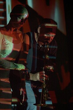 "These are not only video-sequences, deluging the surfaces from which they appear. These are not only intermittent bunches of rays, like chasms, to which the artists hold on to. Like in a natural living space. Two video-projectors, interfering one another, create luminous conditions, rhytmical, there, where the concrete becomes abstract. Where the surfaces become voluminous fields, without forcing music or choreography. Marriage of the fixed time, fixed in light – and in the improvisation. Courants question the simultanity of biological and natural time, of permanence and the organical, of sequence and necessity. Between the determined and the moving, between the predictable and the reference to the not predictable, Courants are an audio-visual ensemble, in which every artist brings with him/her the required ingredient for the unbalance."