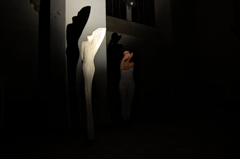 Beide Ebenen, Video und Skulpturen, verschmolzen in der im Dunkeln durchgeführten Tanz-Musik-Performance zu einem Gesamtkunstwerk der besonderen Art.