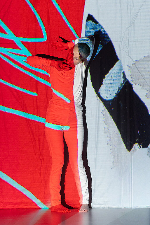 Die Tänzerin Fine Kwiatkowski setzt sich in Verbindung zur Malerei. Ihre abstrakten Körperbilder beeinflussen und verändern diese. Der Perkussionist Reinhart Wronna, vom Orchester des Staatstheaters, erweitert die Wahrnehmungsebenen durch seine im Moment erspielten Klänge.